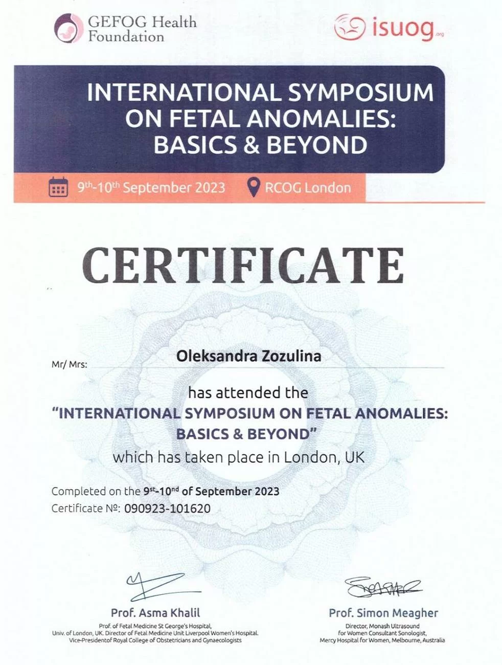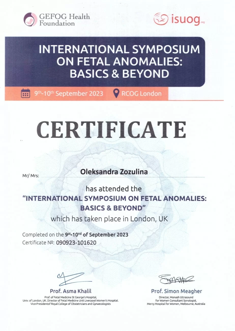 • Международный симпозиум по аномалиям плода (International Symposium on Fetal Anomalies: BASICS & BEYOND). Получила Сертфикат участника № 090923-101620