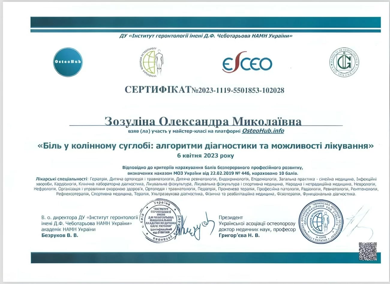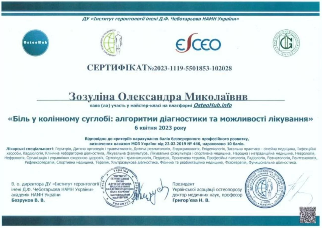 Сертификат № 2023-1119-5501853-102028 об участии в мастер-классе "Боль в коленном суставе: алгоритмы диагностики и возможности лечения", который состоялся 6 апреля 2023 года на платформе OsteoHub