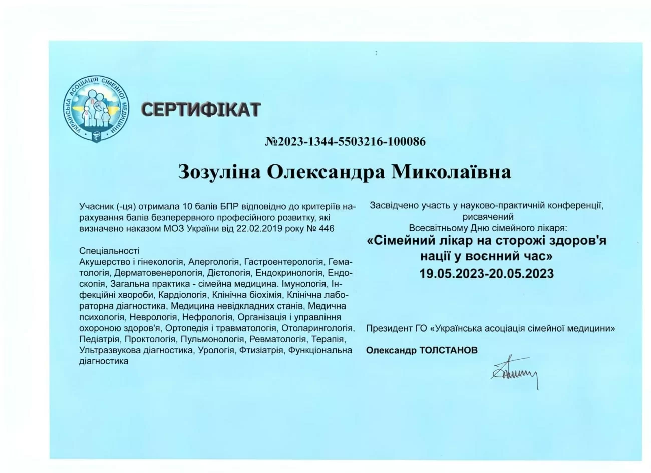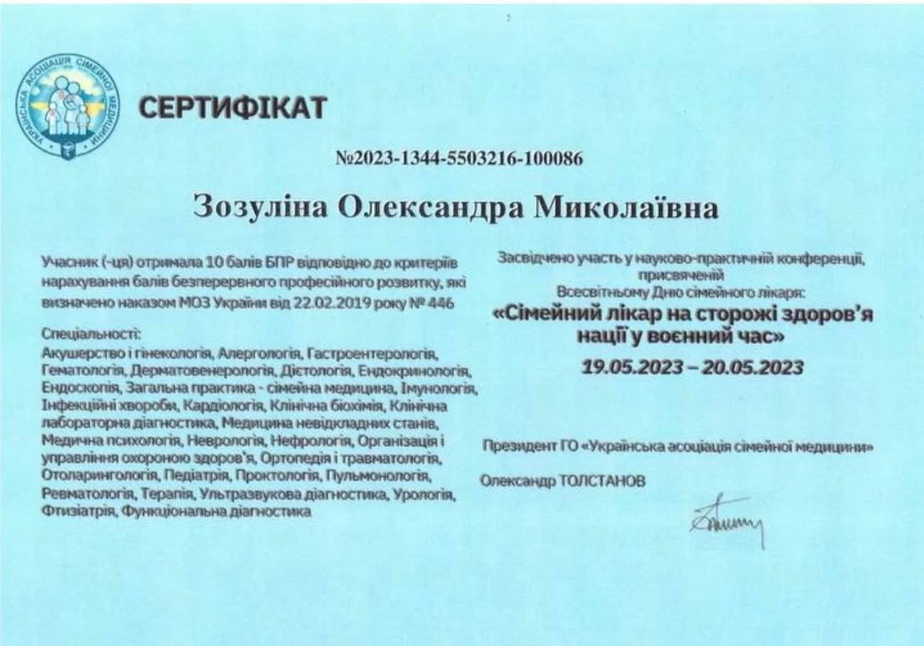 • Участие в научно-практической конференции «Сімейний лікар на сторожі здоров'я нації у воєнний час», что подтверждается сертификатом № 2023-1344-5503216-100086