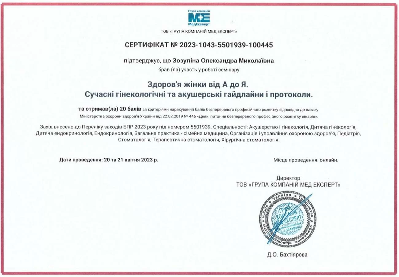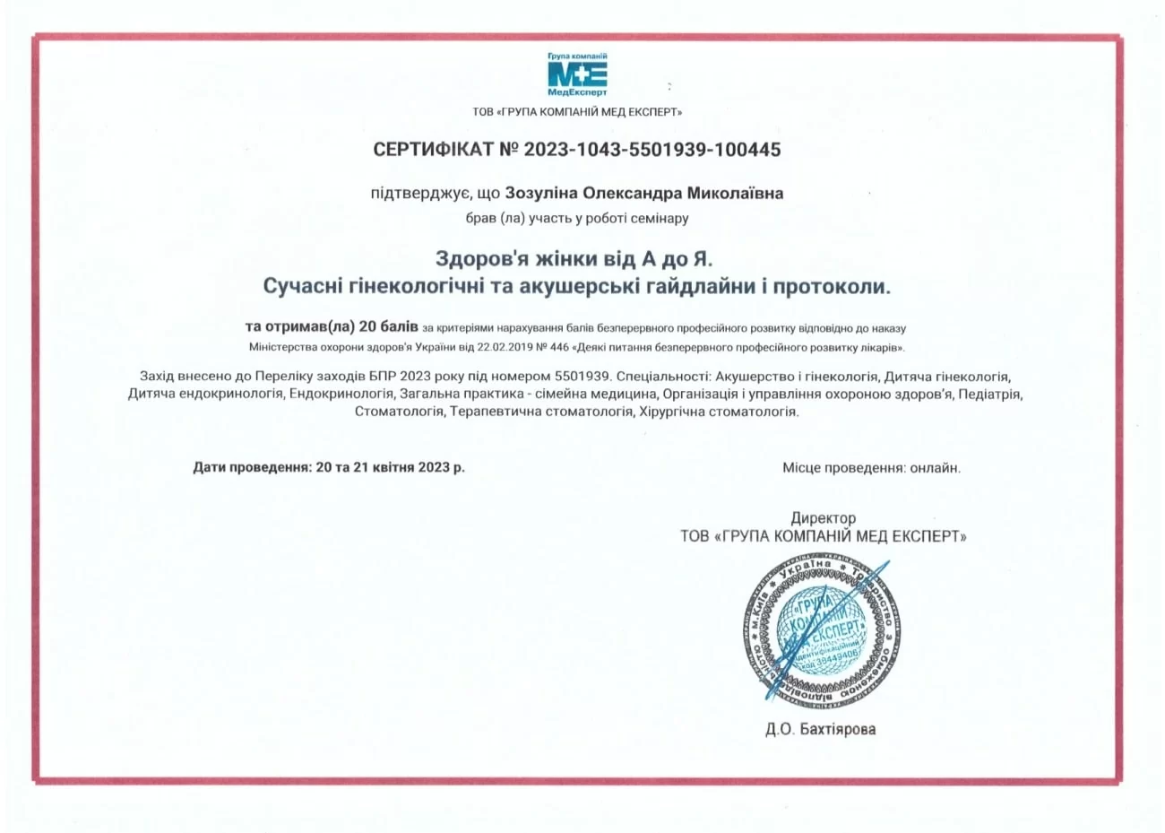 Сертификат № 2023-1043-5501939-100445 подтверждает участие в работе семинара "Здоровье женщины от А до Я. Современные гинекологические и акушерские гайдлайны и протоколы"