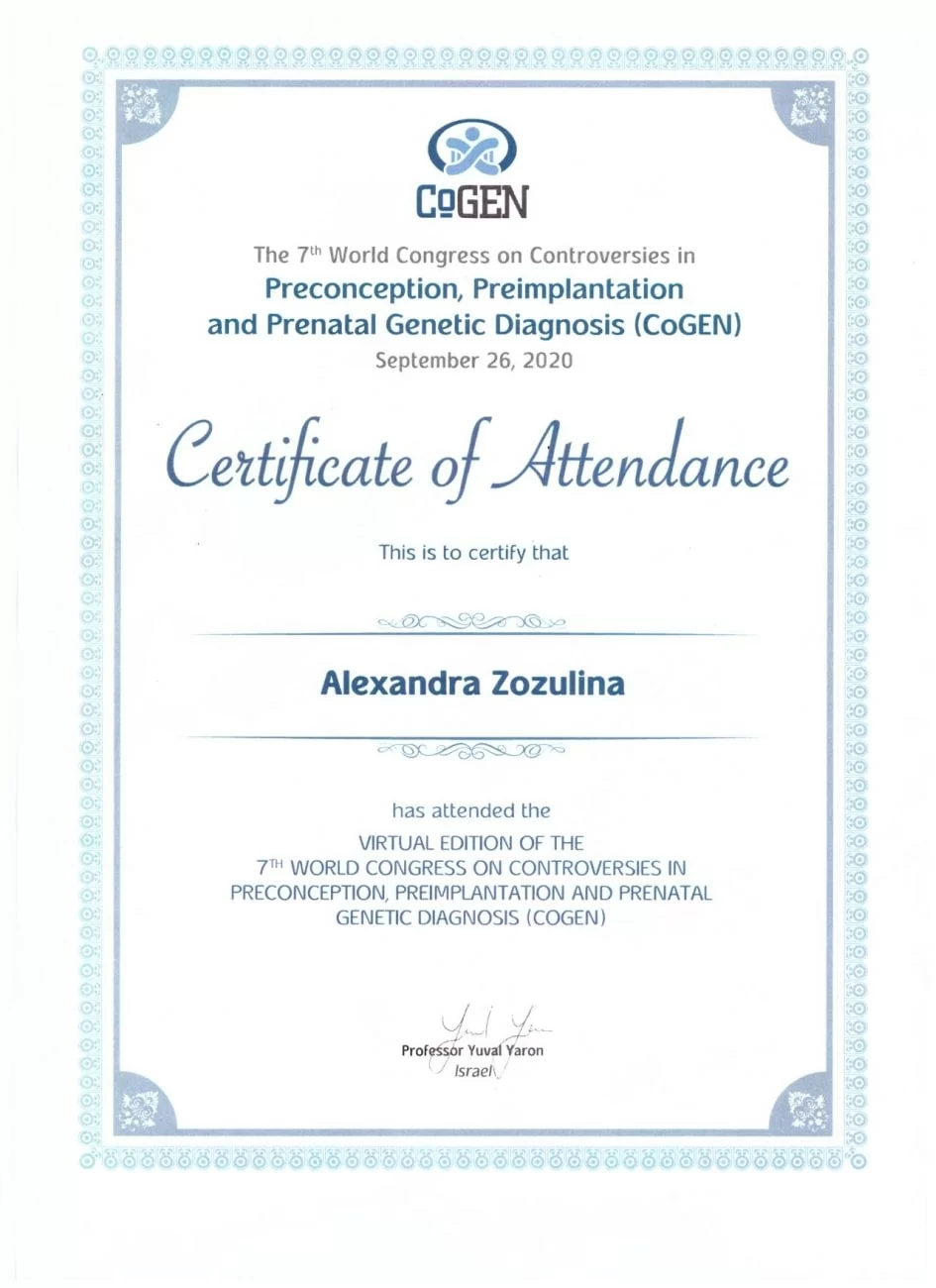 • 7-й Всемирный конгресс по вопросам предзачатия, преимплантационной и пренатальной генетической диагностики. Получила Сертификат участника.