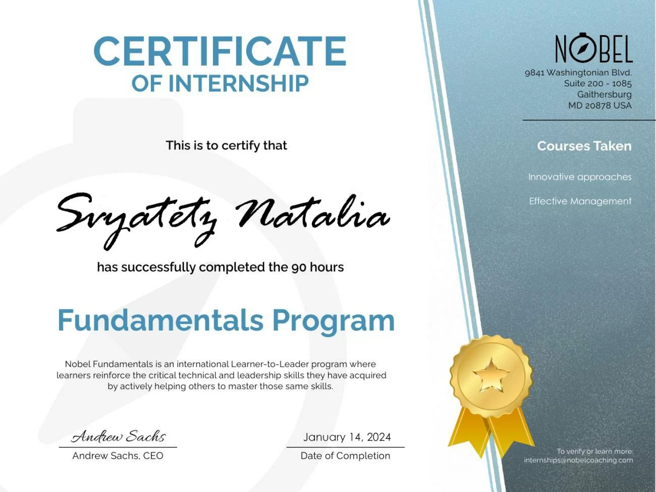 Прошла фундаментальную программу по курсам: Инновационные подходы и Эффективное управление, о чем получен сертификат участника14 января 2024 года