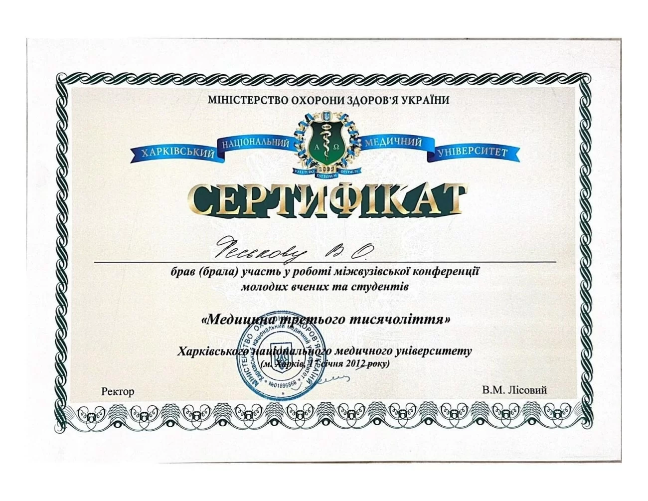 Грамота за II место на межвузовской конференции молодых ученых и студентов "Медицина третьего тысячелетия" Харьковского национального медицинского университета секция "Акушерство и гинекология"18 января 2011, г. Харьков, Украина