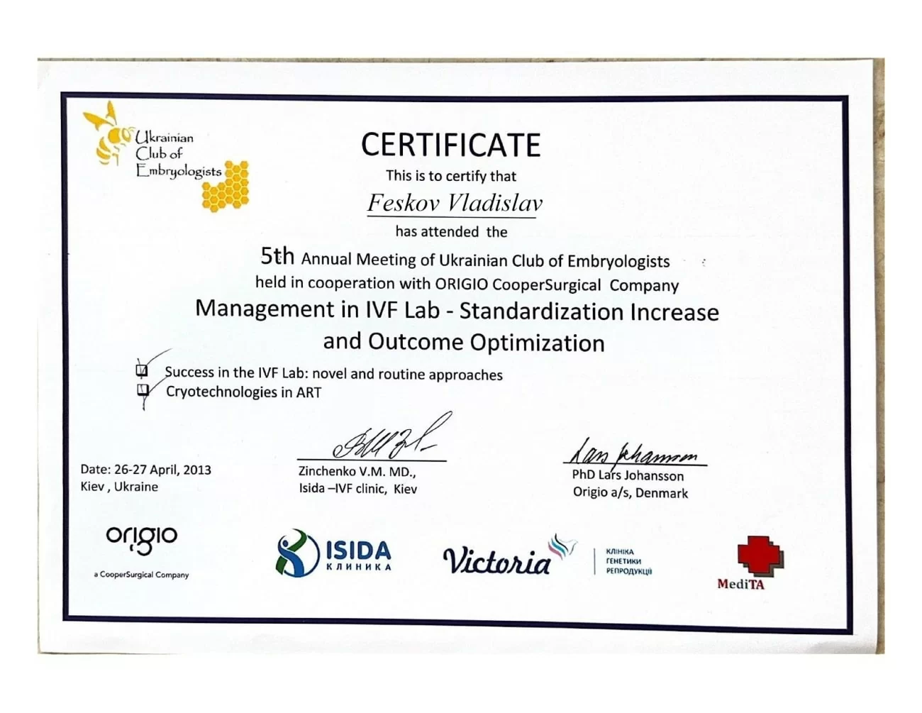 Сертификат участия в 5-ом Ежегодном собрании Украинского клуба эмбриологов совместно с руководством компании ORIGIO Cooper Surgical по теме "Повышение стандартизации и оптимизация результатов. Успех в лаборатории ЭКО: новые и рутинные подходы Криотехнологии в ВРТ"26-27 апреля 2013, Киев, Украина